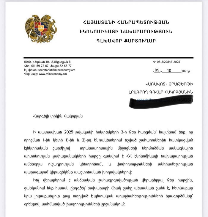 Առավոտ.am-ին  ԿԳՄՍ նախարարությունից գրավոր պատասխանել են, որ էլեկտրային շարժիչով տրանսպորտային միջոցների ներմուծման սակագնային արտոնության չափաքանակների հարցը գտնվում է էկոնոմիկայի նախարարության ամենօրյա ուշադրության կենտրոնում, եւ փոփոխությունների անհրաժեշտության պարագայում կիրազեկեն պաշտոնական խողովակներով:
