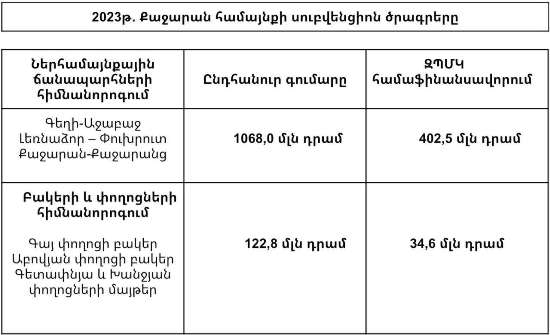 Ստորև ներկայացված են Քաջարան համայնքում 2023թ․ սուբվենցիոն ծրագրերով նախատեսված աշխատանքները։